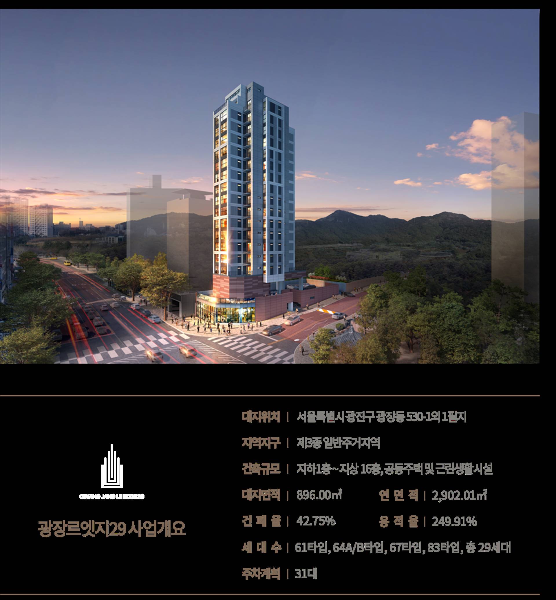 단 29세대만을 위해 특별하게 설계된 소규모 아파트로 광장동의 품격을 한 단계 높이는 희소성 높은 주거 공간을 제공합니다.